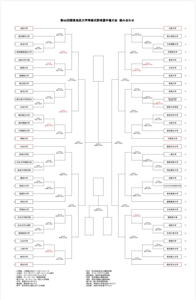 初戦は3月11日(水)10:00PB予定、所沢航空記念公園野球場にて行われます。対戦相手は国士舘世田谷vs共栄大学の勝者です。